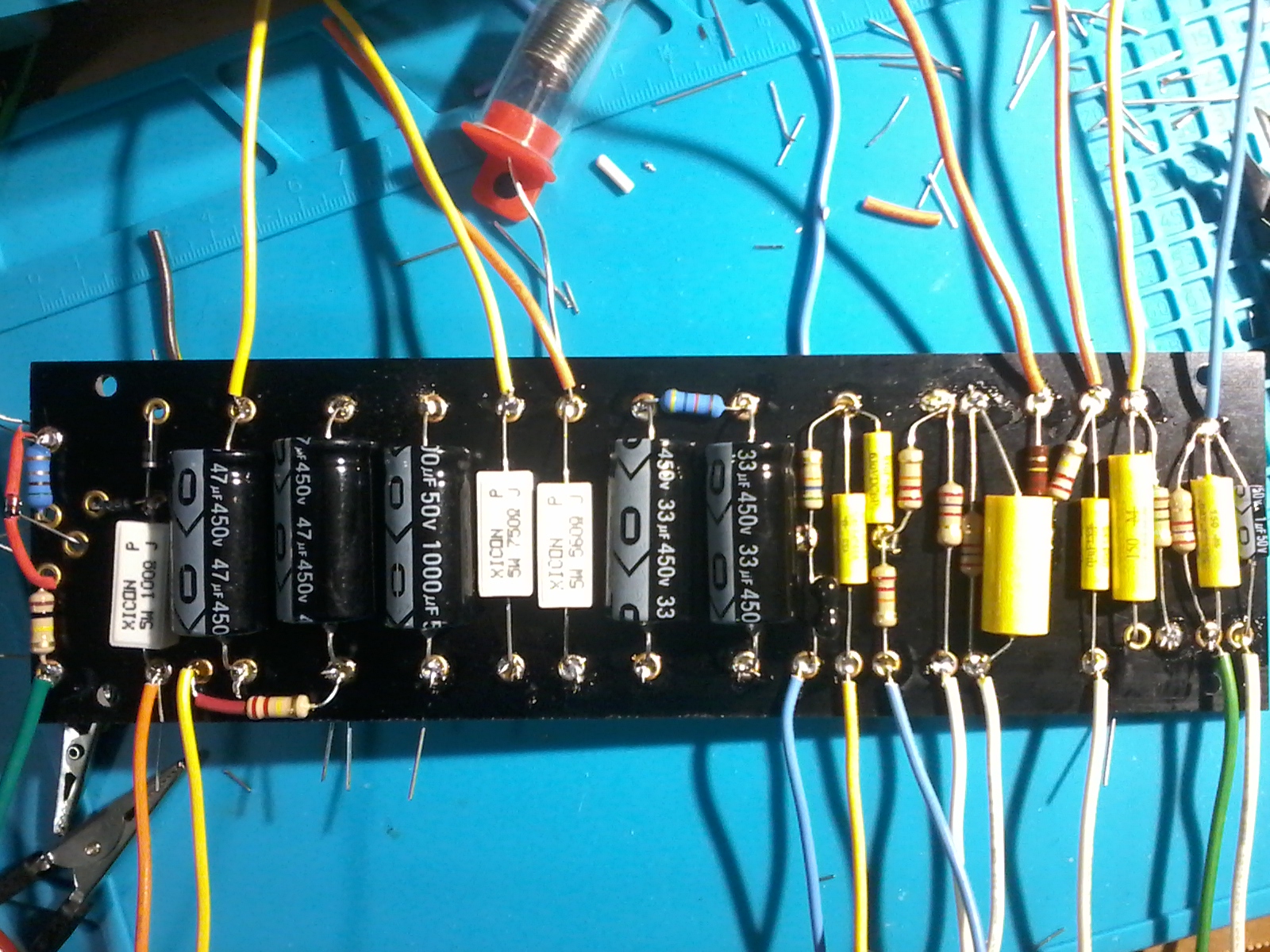 I said some chants to various gods (hendrix, john lee hooker) and fired it up with no tubes. The LED lit up and the current limiter did not. It looked good. I measured DCV at the first 50uf cap with power level knob at idle and it read about 8 volts (instructions say to expect +400). The second cap read 430 volts. Instructions say to check at the rectifier pins which I do not understand as there is no rectifier tube. I shut it down.
