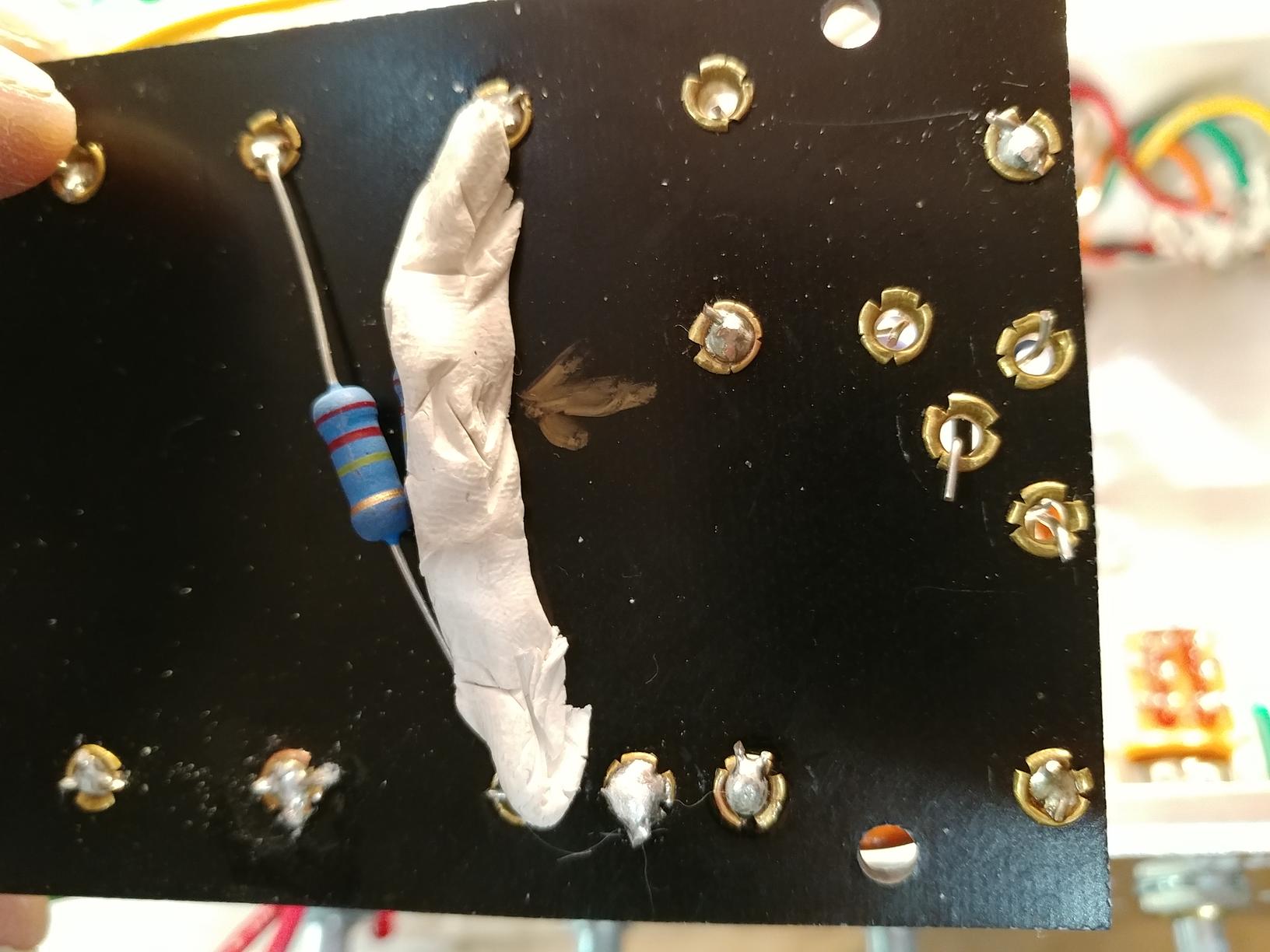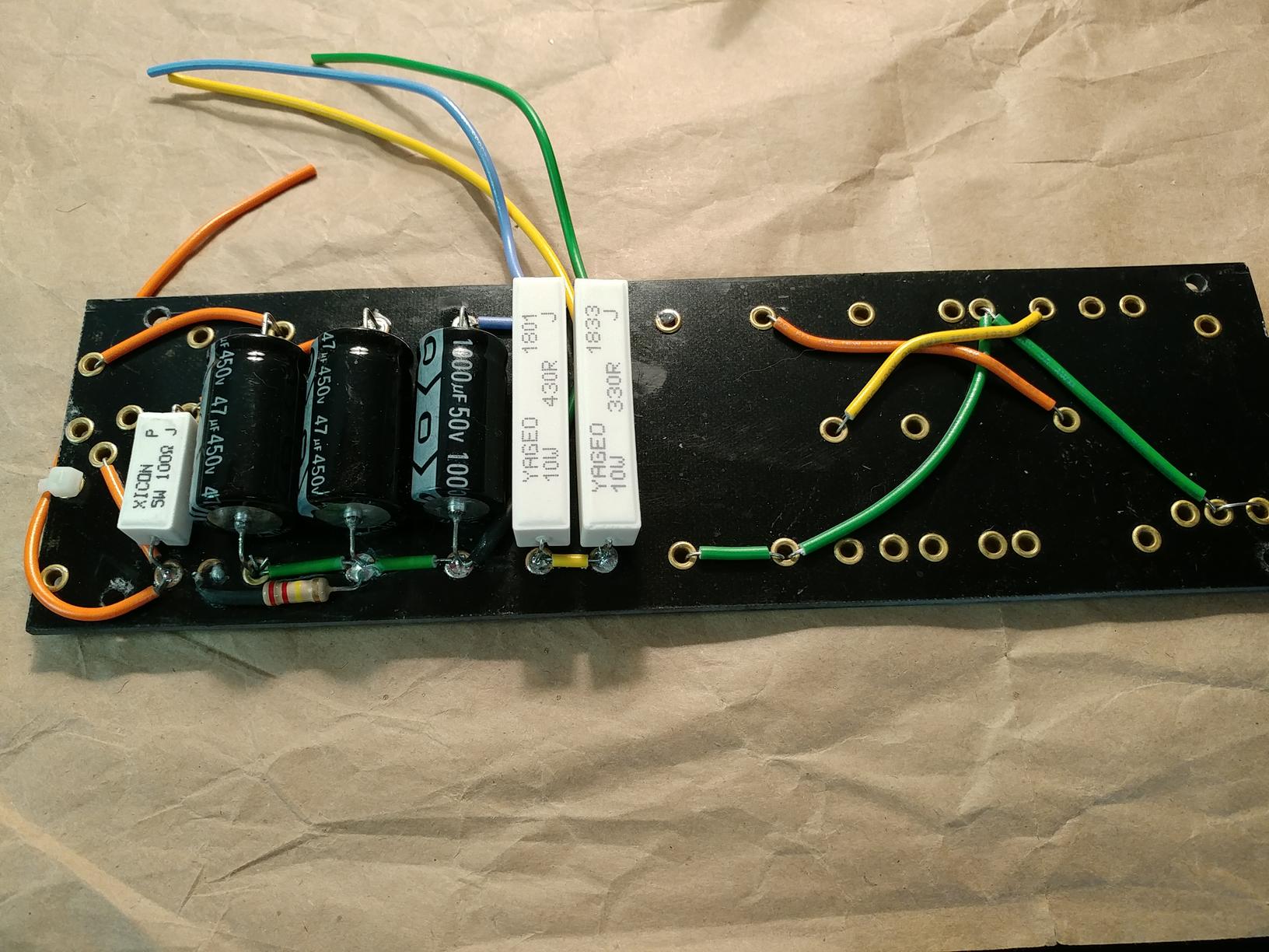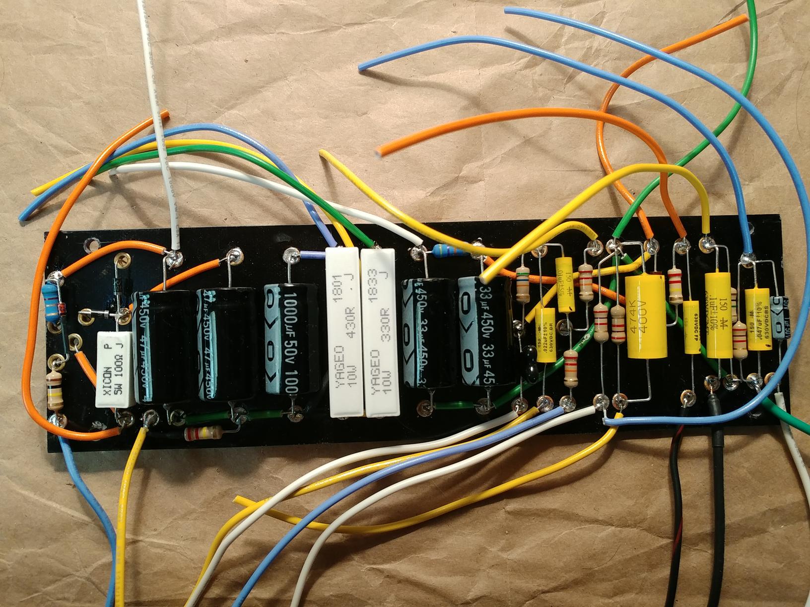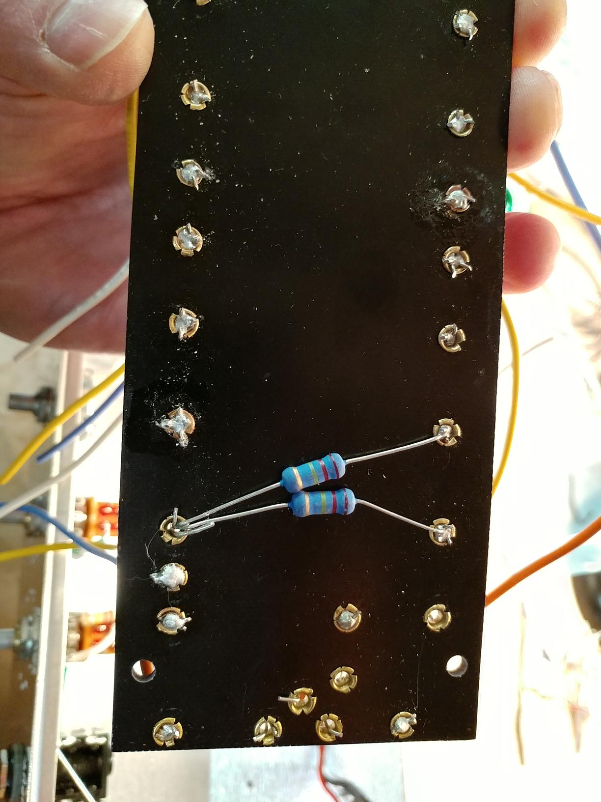 The photo above also shows a little clip-on heatsink. The tip temperature I'm using is about 100F hotter than I would normally use for tin-lead solder. Also, the eyelet joints take quite a bit of dwell time to get up to temperature. This makes me worry about how much heat gets conducted into the components, especially ones with shorter leads, so I used a heat sink on the leads of capacitors and diodes whenever I could fit it.