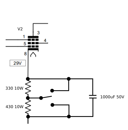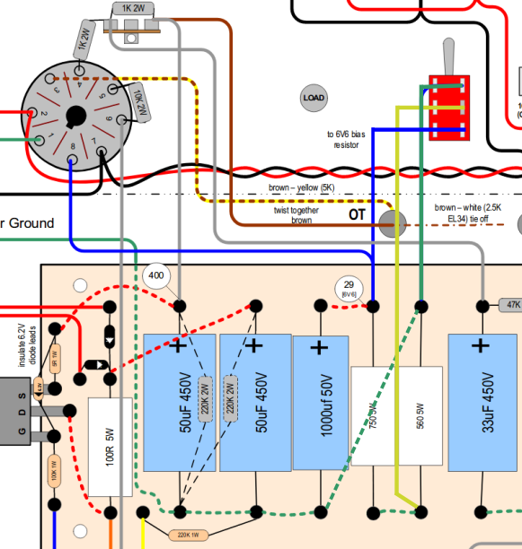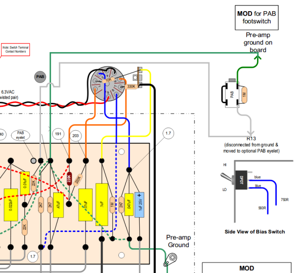 viewtopic.php?f=16&t=6196). This mod changes resistor values, and substitutes a DPDT on-off-on three position switch to give bias settings for 6L6, EL34, and 6V6. Here's a schematic showing what I did. The tube in this schematic is V2, and the resistors and switch replace R15 and S4.