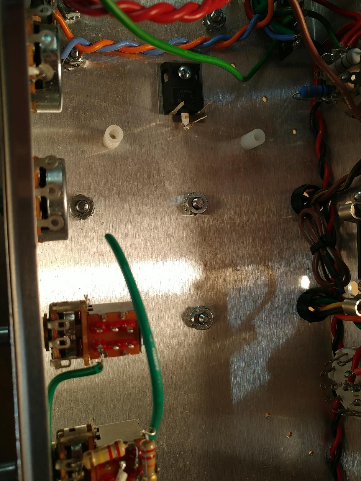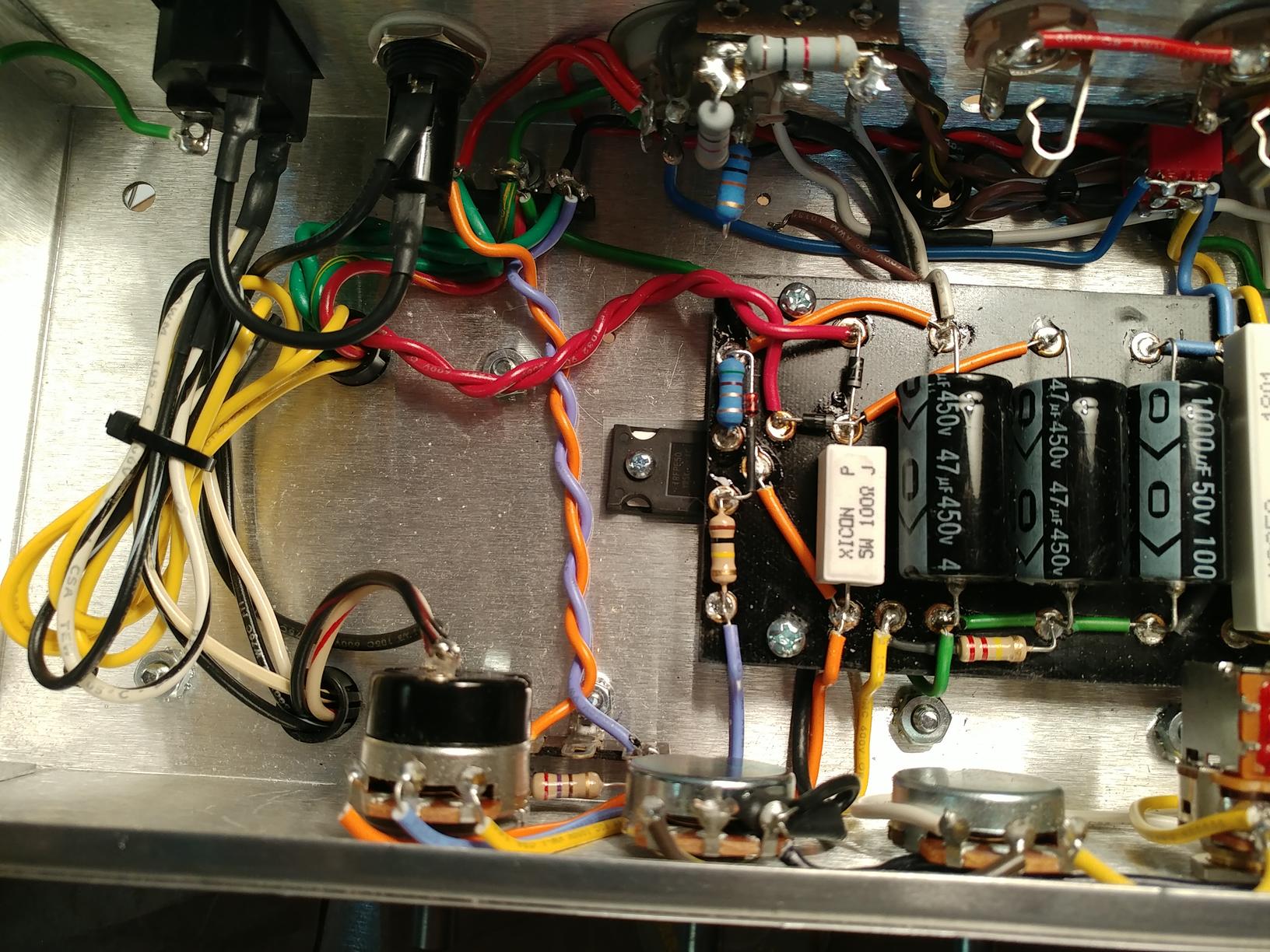 I used 10 Watt power resistors for the new bias circuit (vs. the stock 5 Watt resistors). I don't think this was strictly necessary. Even allowing for the nominal 29V cathode voltage of V2 to be a little high (say, 33V) and the 330 Ohm resistor to be 10% low (297 Ohms), the power dissipated by the resistor is still under 4 Watts in 6L6 mode. OTOH, I don't want the neighboring electrolytic caps to get too hot, and the larger size of the 10W resistors spreads the heat dissipation out, so it seemed like a good call.