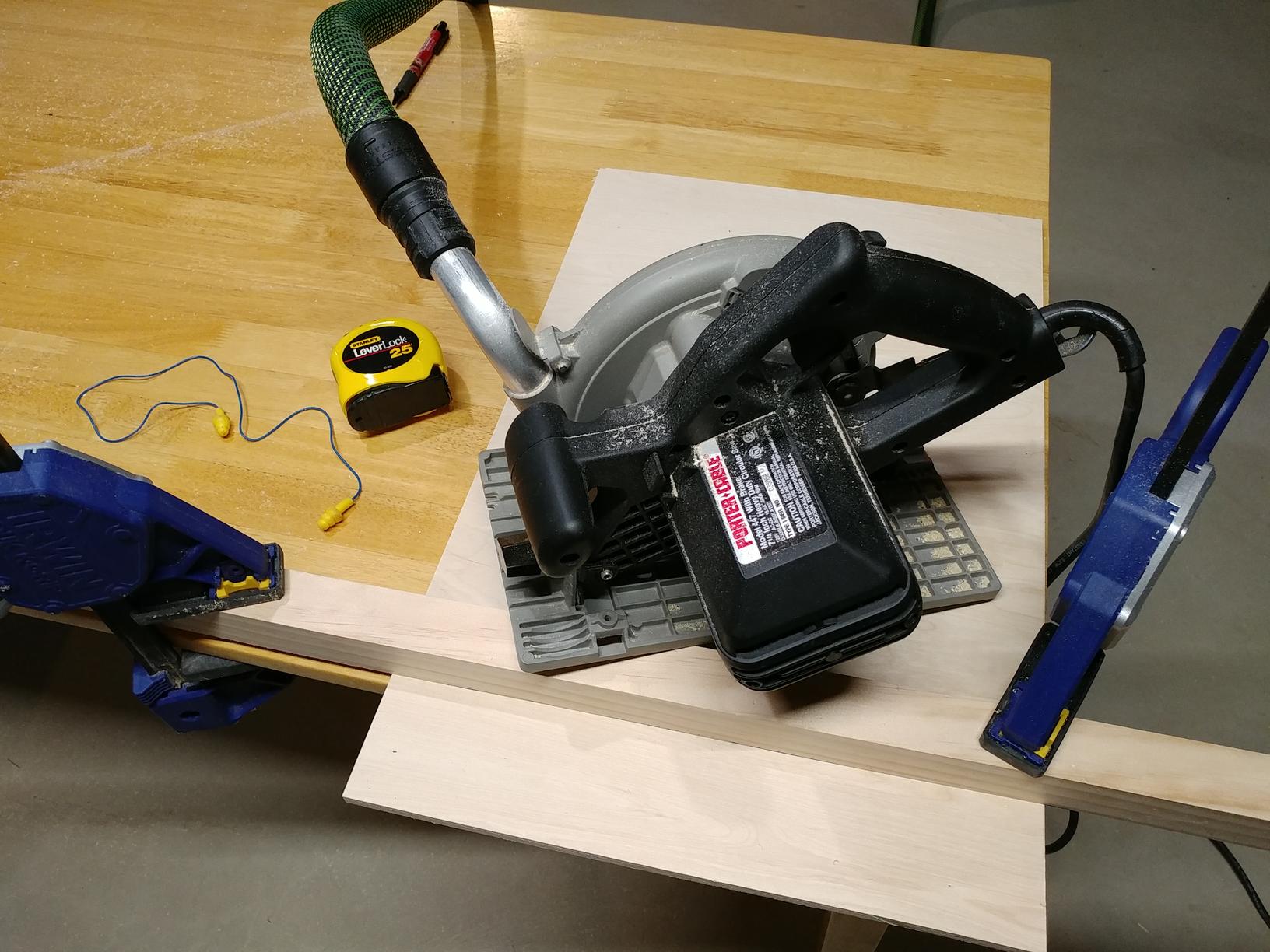 After making sure the basic fit was OK, I cut 1" strips of 1/4" plywood to give the grill cloth some standoff from the face of the baffle. I softened all the sharp edges with a piece of sandpaper, then glued and screwed the 1" strips to the baffle board. The spring clamps in the picture were what I had available, but they're the wrong tool for the job. They don't keep the wood from sliding. You can imagine picking up the baffle in the picture below. The glue hasn't set, so it's still really slippery. Gravity pulls the handles of the clamps down, and that walks the 1" strip just a little bit off the edge of the baffle. I was able to get things lined up fine, but it was finicky and frustrating. next time I'll get some small C clamps. I used #6 x 1/2" screws with 5/64" pilot hole. I used flathead screws, and countersunk the pilot holes so the heads of the screws wouldn't interfere with the grill cloth.