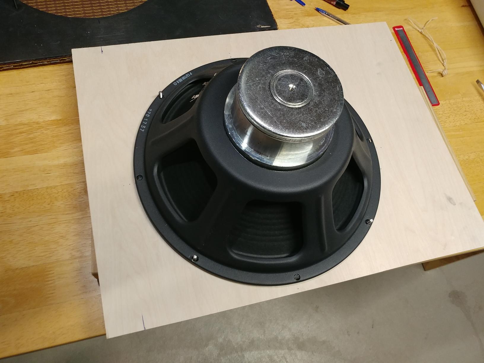 With the grill cloth and staples, the baffle just barely fit the cabinet. I'm surprised at how much space get eaten up. Maybe 3/16"? That's only a guess, but I'm glad now that I didn't cut the board any bigger.