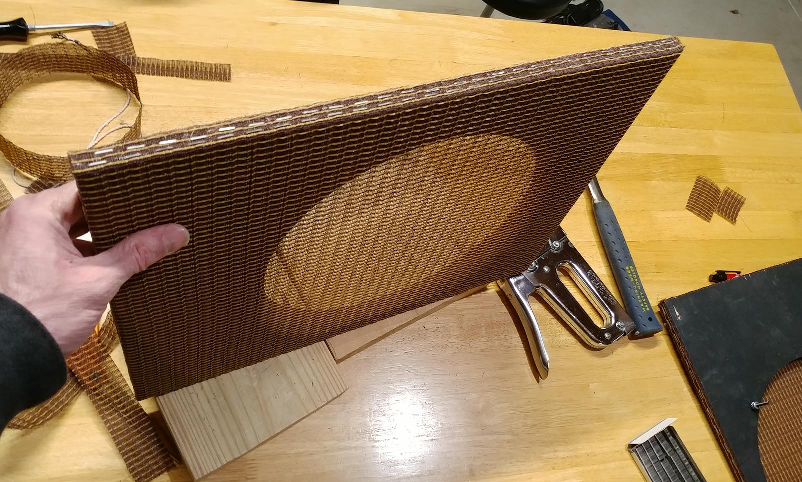 Keeping the grill cloth tight while attaching it was tricky. Fortunately my wife is both talented and strong, so between the two of us it went pretty well. We used 3/8" T50 staples. The staple gun was just about strong enough to drive these into the plywood, but we wound up tapping quote a few of them in with a hammer to tighten them up.