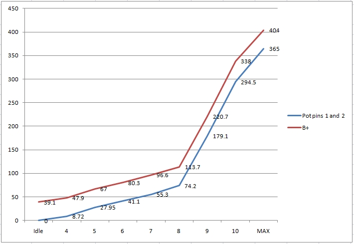 I measured the voltages at B+, across pins 1 and 2 of the VRM Pot and put them in the graph.