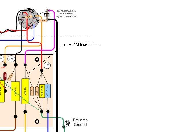 The easy solution if you built your amp this way, is to clip the 1M off at C1, run a wire from the other side of C1 to the 1M. Or just replace the 1M (email for new part a 1M, 1/2W carbon film/metal film will work fine.).