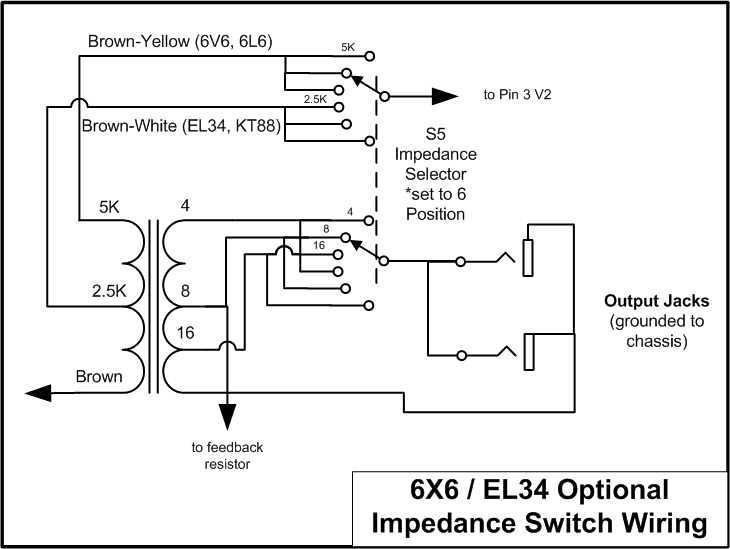 There appears to be an error in the Tramp switch schematic. The schematic shows both EL34 & 6L6 using the 2.5K switch setting. Shouldn't the 6L6 (and 6V6) use the 5K switch settings (Positions 1, 2, & 3) and the EL34 use the 2.5K switch settings (Positions 4, 5, & 6)?