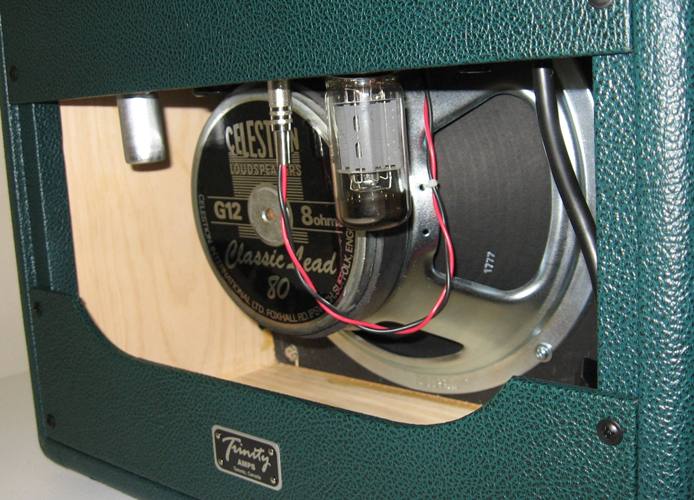 Next I tried out a WGS Green Beret to check for clearance...didn't fare too well. While I had an easily accessible output jack hole, since the speaker isn't nearly as deep as the Celestion Blue, the magnet diameter was just too wide...it really interfered with the rest of the chassis. I don't think the 6-position switch would be usable in its intended position: