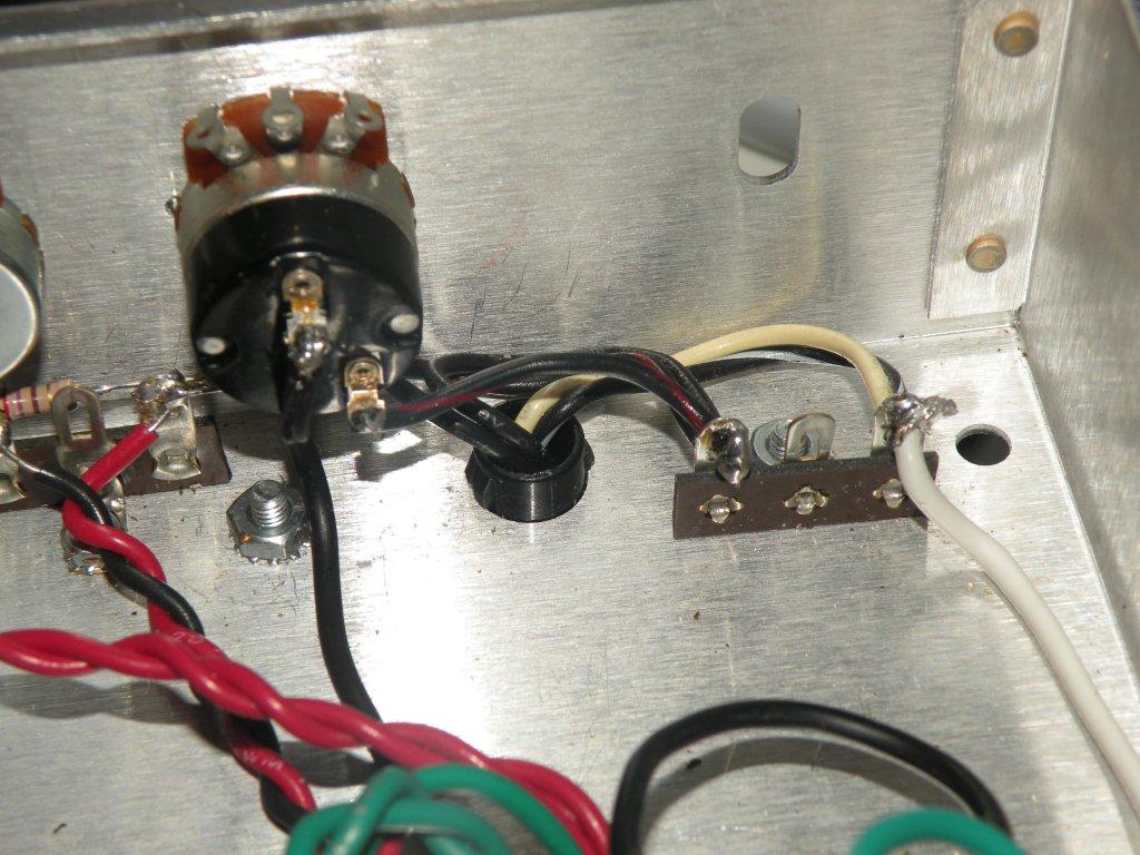 The first task was to put the tube sockets, the grommets and the five terminal strips in place. This was easy to do. However, all four of my grommets were the same size, and this meant that the six wires from the power transformer that went through one of these grommets were tight. I hope that this does not create a problem. They ain't coming out. I then wired the pilot led and its resister; notice the bad photography. I also conected the black and red twisted wires that go from the power tube to the preamp tube and to one of the terminals (but no pictures just of it--they are seen in two post further down this thread).