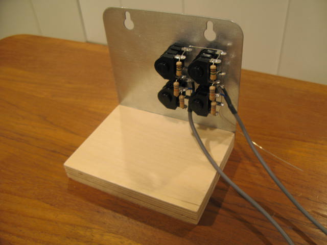 Wiring the input jacks was next. If space inside the chassis is cramped, a good tip is to temporarily install the jacks on the outside of the chassis while you do the wiring. But I went a bit further and made a little jig to hold them in the proper position instead. This let me rotate the jacks into whatever position I needed to install the resistors and wires and it was easier than moving around a heavy chassis.