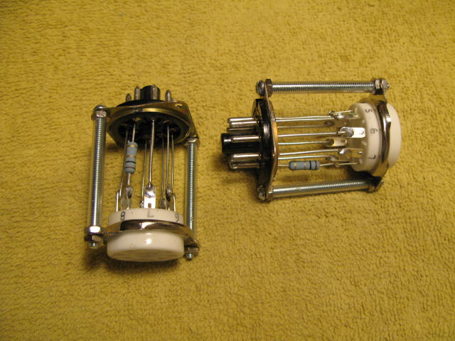The bias for the output tubes had to be adjusted next. The original Hiwatts don't have built-in bias test points and neither does mine. So I rigged up a couple of "bias probes" using the 8-pin plugs from a couple of old relays, a couple of 8-pin tube sockets and a couple of 1-ohm resistors. These aren't as fancy as the commercially available probes, but they let me measure the cathode current and the anode voltage easily from outside the chassis.