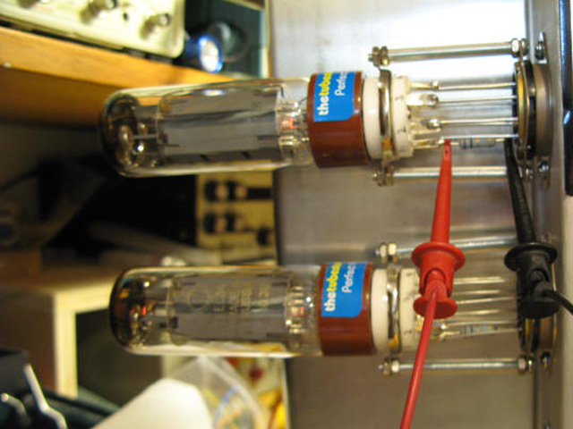 I powered it down and waited for the capacitors to discharge, then I plugged in the two EL34 output tubes and a dummy load. I applied power in the Standby mode. All the tubes glowed normally. It was beginning to look like the amp would work the first time, but when I took it out of Standby, I heard a loud rattling noise coming from the EL34s.