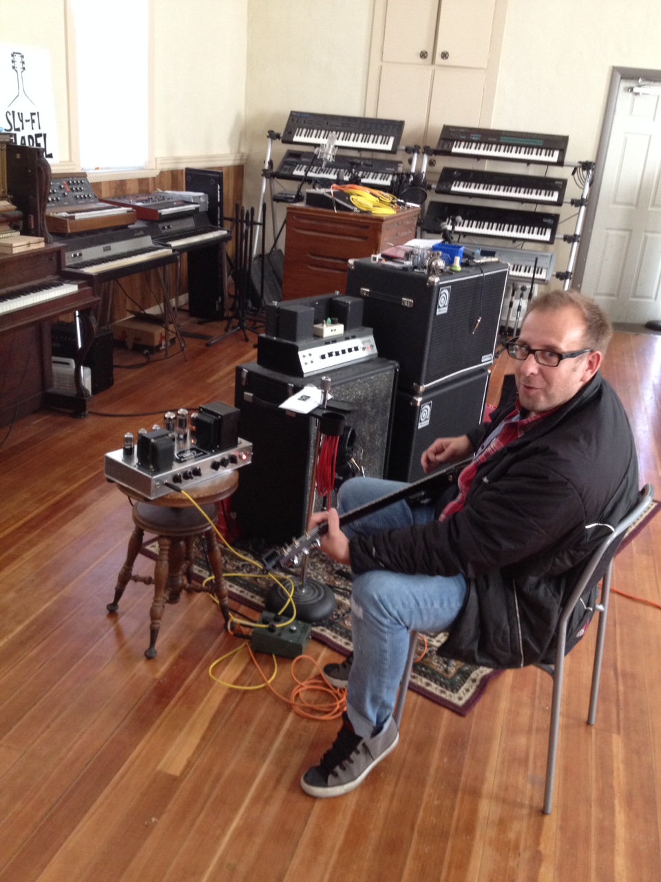 Brent Bodrug tested the Bass Amp in his studio . It was up against an Original Ampeg B15 from the 70's. Brent starts off with a PRS Mira to try out the Bass Amp. We did get around to using a Fender Bass but we need a real BASS player!! You can see his 70's original Ampeg fliptop beside the Bass Amp. We did do sonic comparisons and you can see Brent's reaction. It remains in Sly-Fi Chapel Studio for now!