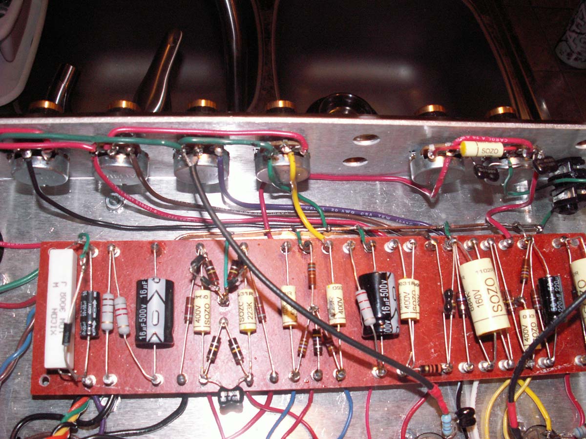 The preamp section now only has one jack with both channels connected to the one jack so I can use either the normal, mixed or TMB controls all the time by using the volume knobs. There is a .01uf cap from the jack ground to chassis ground as well. The one jack was partially an attempt to kill noise (less input jacks, less wires = less chance for noise to get in) and also a precursor to trying to set it up for channel switching. That said the amp is WAY too noisy now to even think about adding the switching assuming that circuitry will likely add noise, so I want to quiet it down first