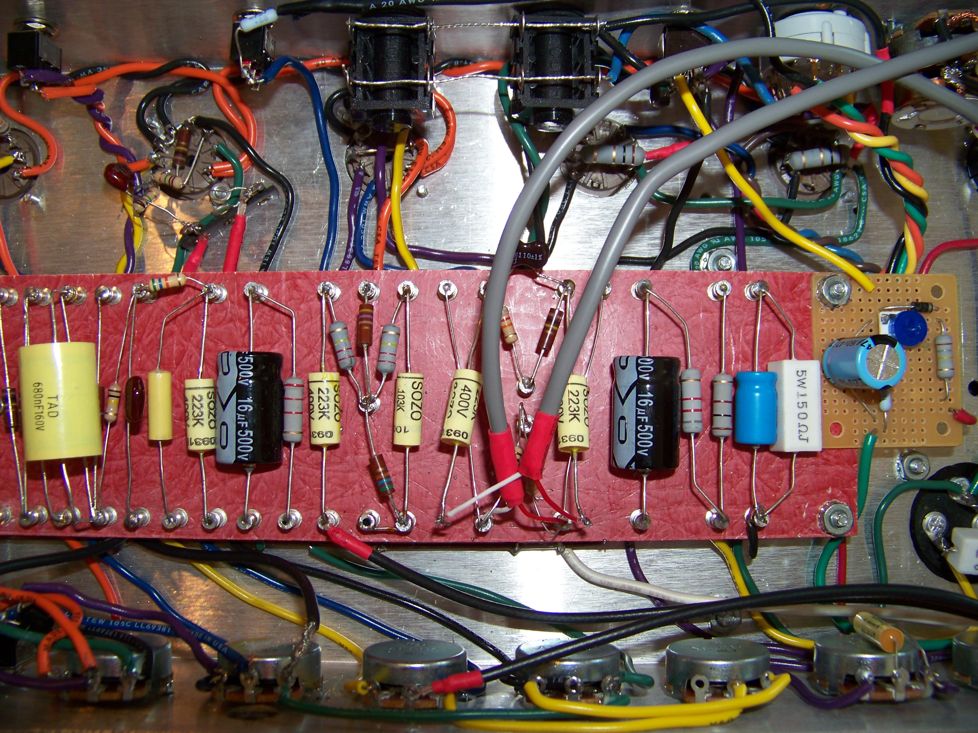 "Just before I buttoned the chassis back up, I thought I might as well try the 'big cathode bypass cap' trick on the EL84s. I squeezed in a 2200uF cap soldered across the existing 220uF one - what a change! This is almost as significant as the split load PI. Much, much smoother distortion sound...."