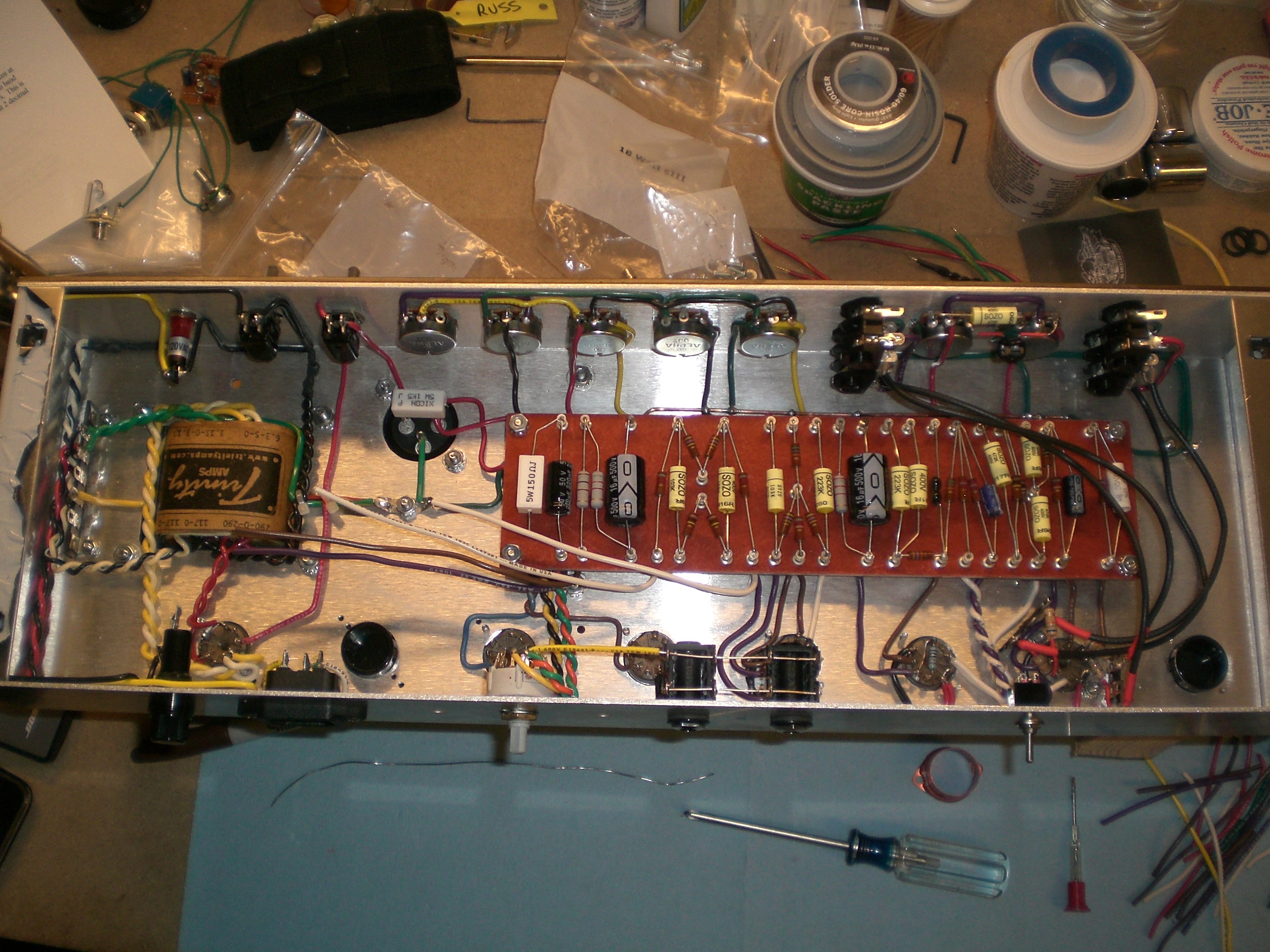 Thanks. The build was really straight forward with just one glitch. The TMB channel didn't work straight away and the voltages were off in the preamp, especially in V2 but a little in V1 and V3. When measuring the voltages there was crackling in the speaker but no noise could be induced through the input jacks. Anyway, long story short I got very lucky and noticed that I had hooked pin 7 of V2 to B+ instead of pin 6. Once this error was corrected all of the preamp voltages fell into place and the thing worked. If you zoom in on this image, you can see the error.