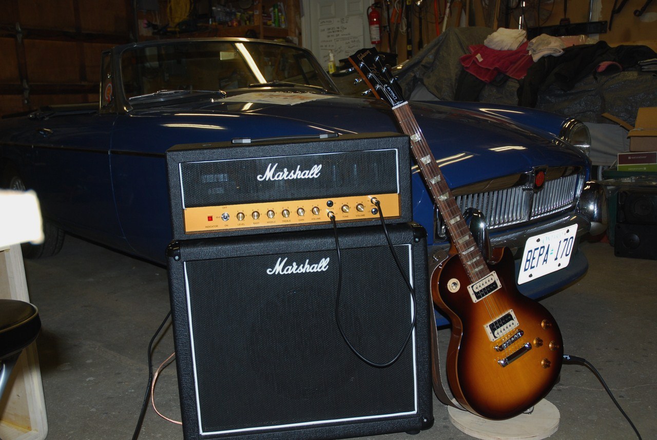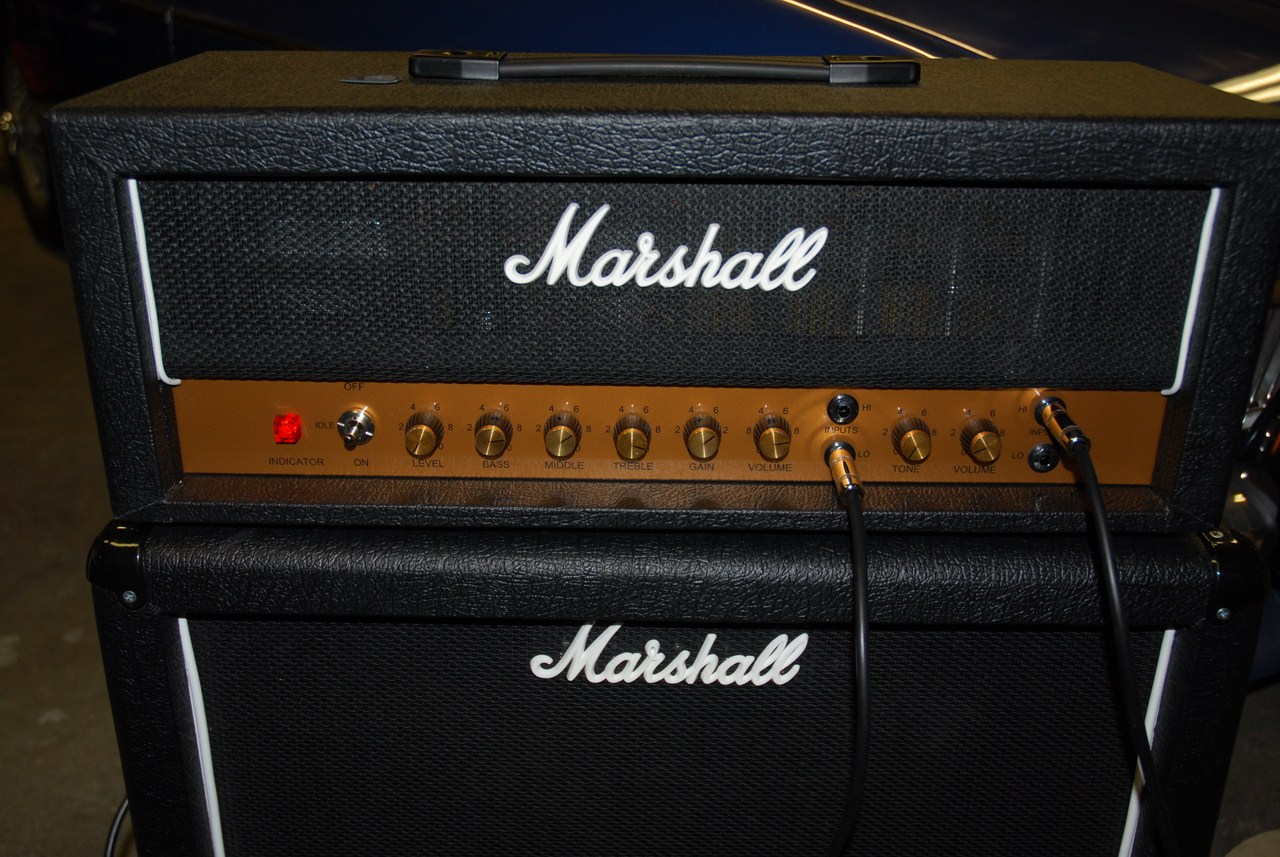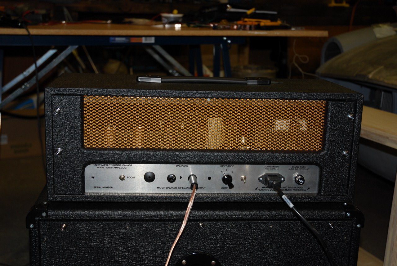 here are some pics of the finished amp.. I did the head cabinet as my take on a 'modern' Marshall 18 Watt.. You can see through the cabinet grill and see the tubes, as per the new Marshall head cabinets, but the size of the cabinet is the 'small' cabinet size. Russian birch ply, Marshall elephant 'tolex', and original Marshall grill cloth from the U.K.