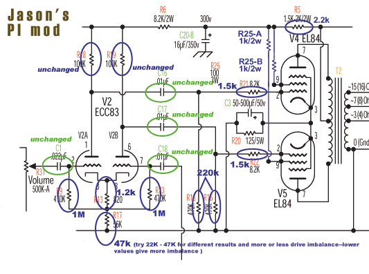 For more clean range you can also change the EL84s' grid reference (grid leak) resistors R18, R19 from 470k to 220k.