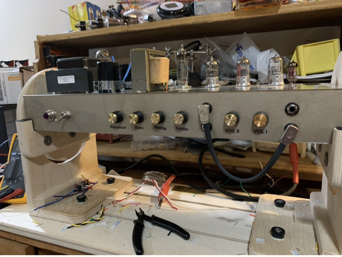 Just finished a super fun build on a trinity 18 watt platform. It borrowed very largely from the mkii circuit with an identical cathode follower and phase inverter, however instead of a normal and tmb channel, I made a normal and bright channel like a full size plexi, and had them mix before the CF instead of at the PI. I did however give V2 its own filter cap and also used a gz34 rectifier.