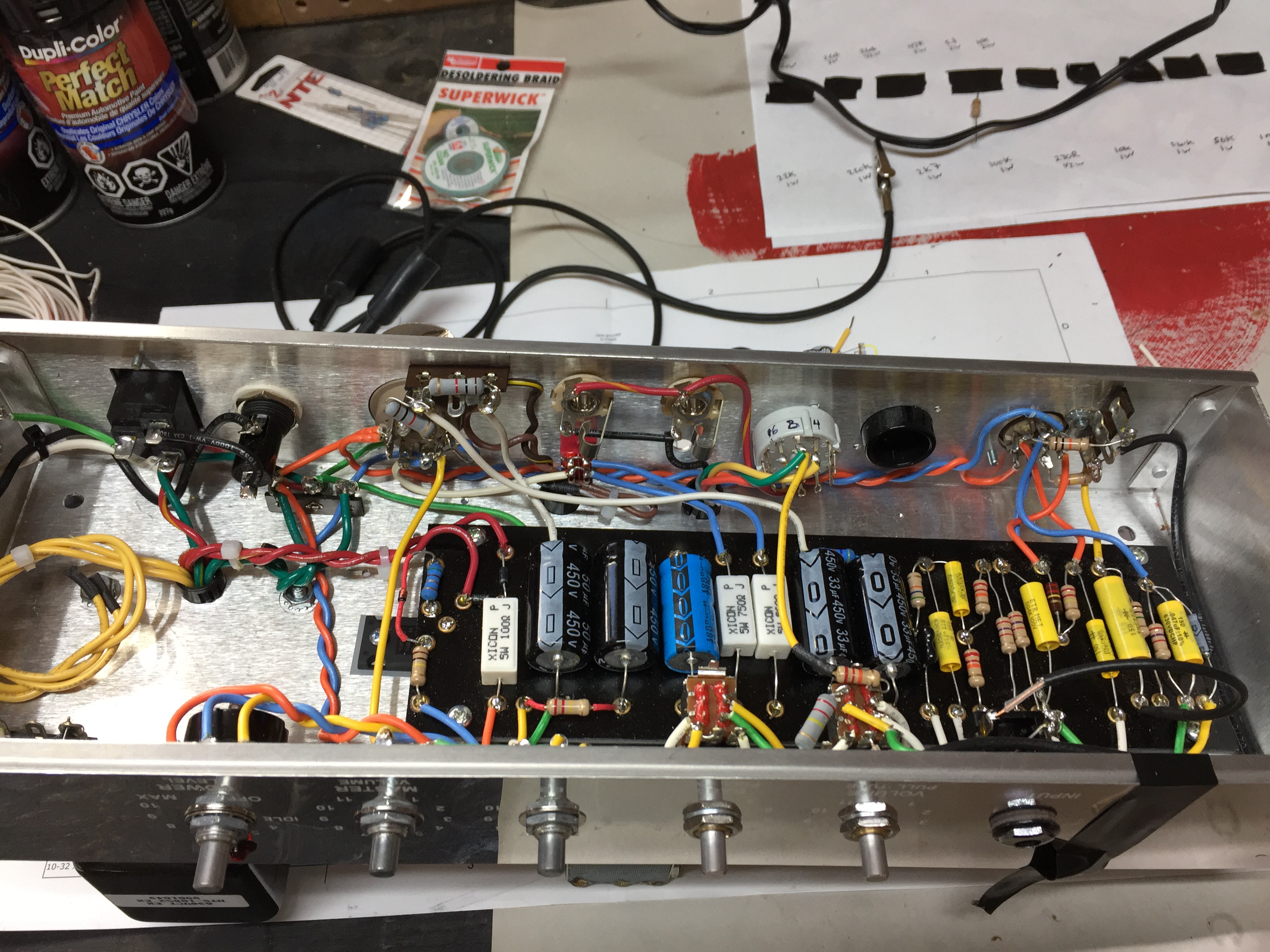 Got the wiring finished this weekend. How does everything look? Sorry I don't have a proper camera to take better pictures. Just need to check point-to-point to the schematic and then I'll build a quick light bulb limiter for first power. Can't wait to hear what it sounds like!