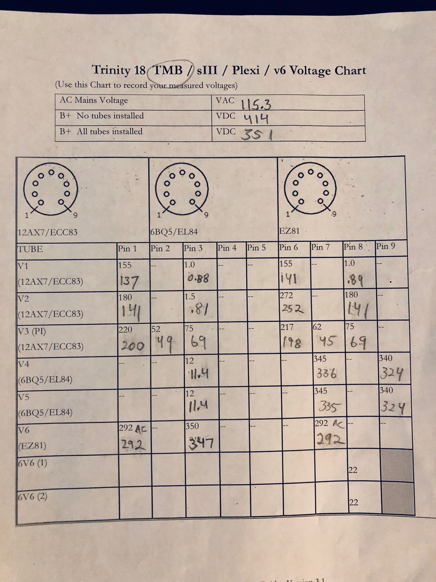 Hello, I recently finished my TMB build, which was my first ever amp building project. I needed some help from this forum along the way, so thank you all! I loves the challenge, it works fine, and sounds really good, but it does not have as much gain as I expected on the TMB channel, even with the gain knob maxed, unless I crank up the volume to impractical levels (or boost the input with a pedal.) Additionally, some of the voltages, particularly on the V2 pins, are pretty low. Do you think these issues are related? Should I troubleshoot the low voltages before pursuing some of the modifications to increase the gain? I have attached the sheet with the tested voltages listed, as well as a photo of the layout. (You will notice some third-party components. I damaged some components during the build and ordered some replacements from amplifiedparts.com) I also attached a photo of the new cabinet I built, also my first. (Craftsmanship is quite rough if you look closely, but it turned out looking pretty cool from a distance!! I am workingon the cab now...) Thanks for any help and advice. -Trey