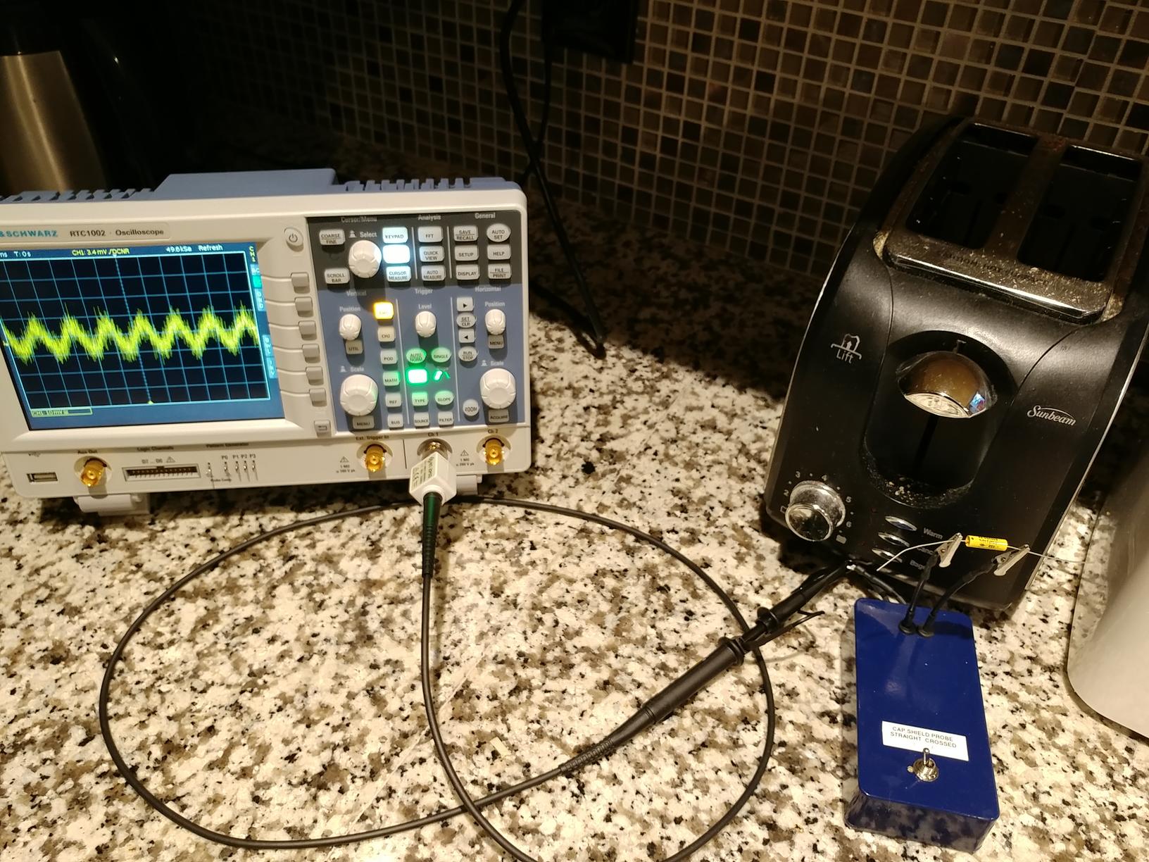 If your scope has a low-pass filter or bandwidth limit, it helps a lot to turn that on. Here are pictures at full bandwidth (50MHz on this scope) and with a 20MHz bandwith limit turned on. You can see that the signal with the limit engaged is much cleaner. The toaster is there just as a good source of 60Hz interference.