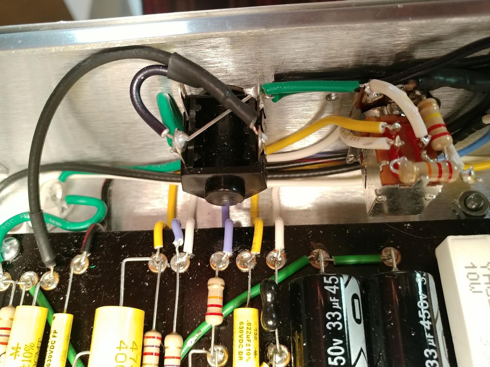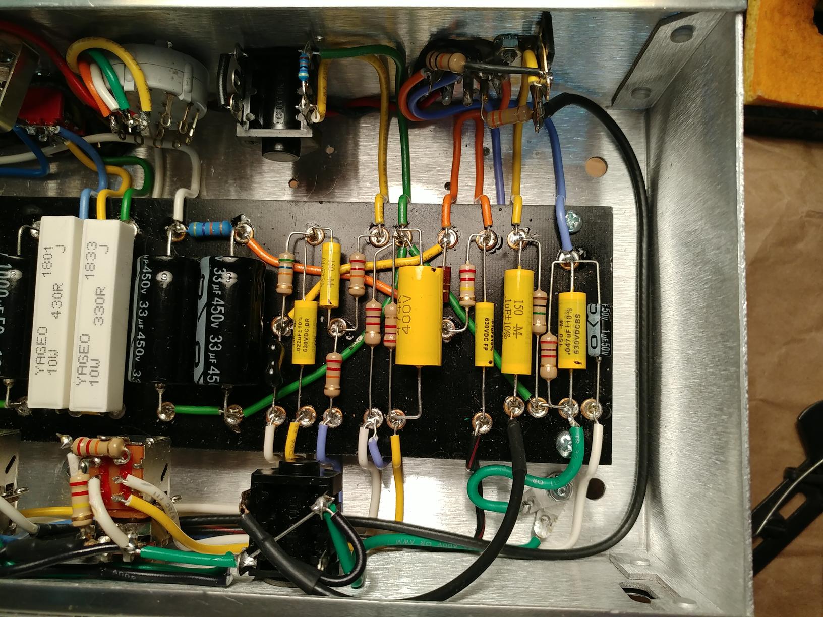The photo above also shows a little clip-on heatsink. The tip temperature I'm using is about 100F hotter than I would normally use for tin-lead solder. Also, the eyelet joints take quite a bit of dwell time to get up to temperature. This makes me worry about how much heat gets conducted into the components, especially ones with shorter leads, so I used a heat sink on the leads of capacitors and diodes whenever I could fit it.