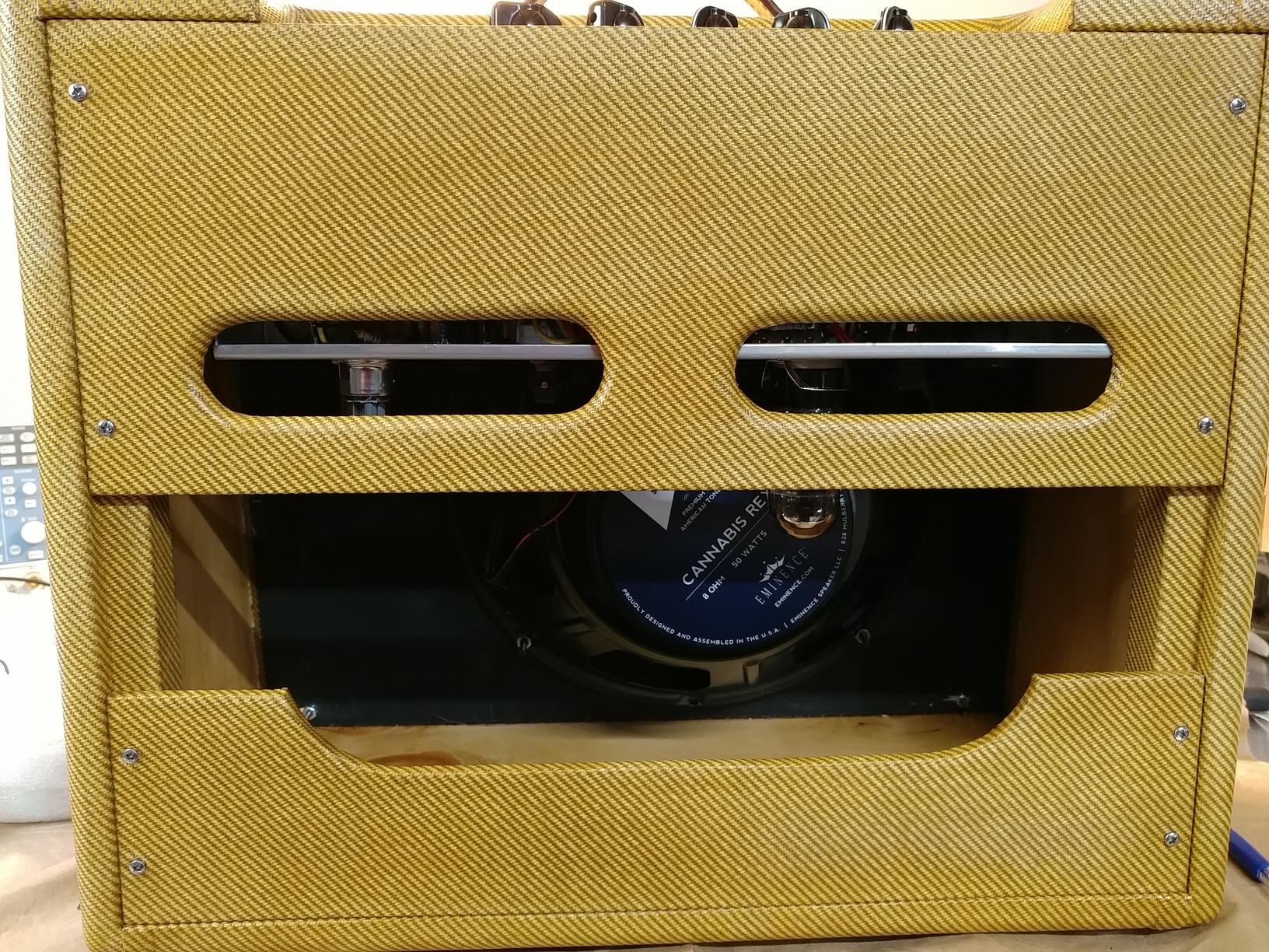 I used 10 Watt power resistors for the new bias circuit (vs. the stock 5 Watt resistors). I don't think this was strictly necessary. Even allowing for the nominal 29V cathode voltage of V2 to be a little high (say, 33V) and the 330 Ohm resistor to be 10% low (297 Ohms), the power dissipated by the resistor is still under 4 Watts in 6L6 mode. OTOH, I don't want the neighboring electrolytic caps to get too hot, and the larger size of the 10W resistors spreads the heat dissipation out, so it seemed like a good call.